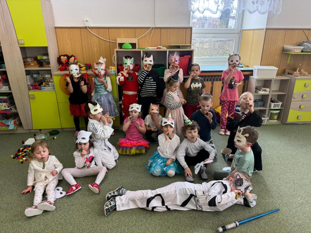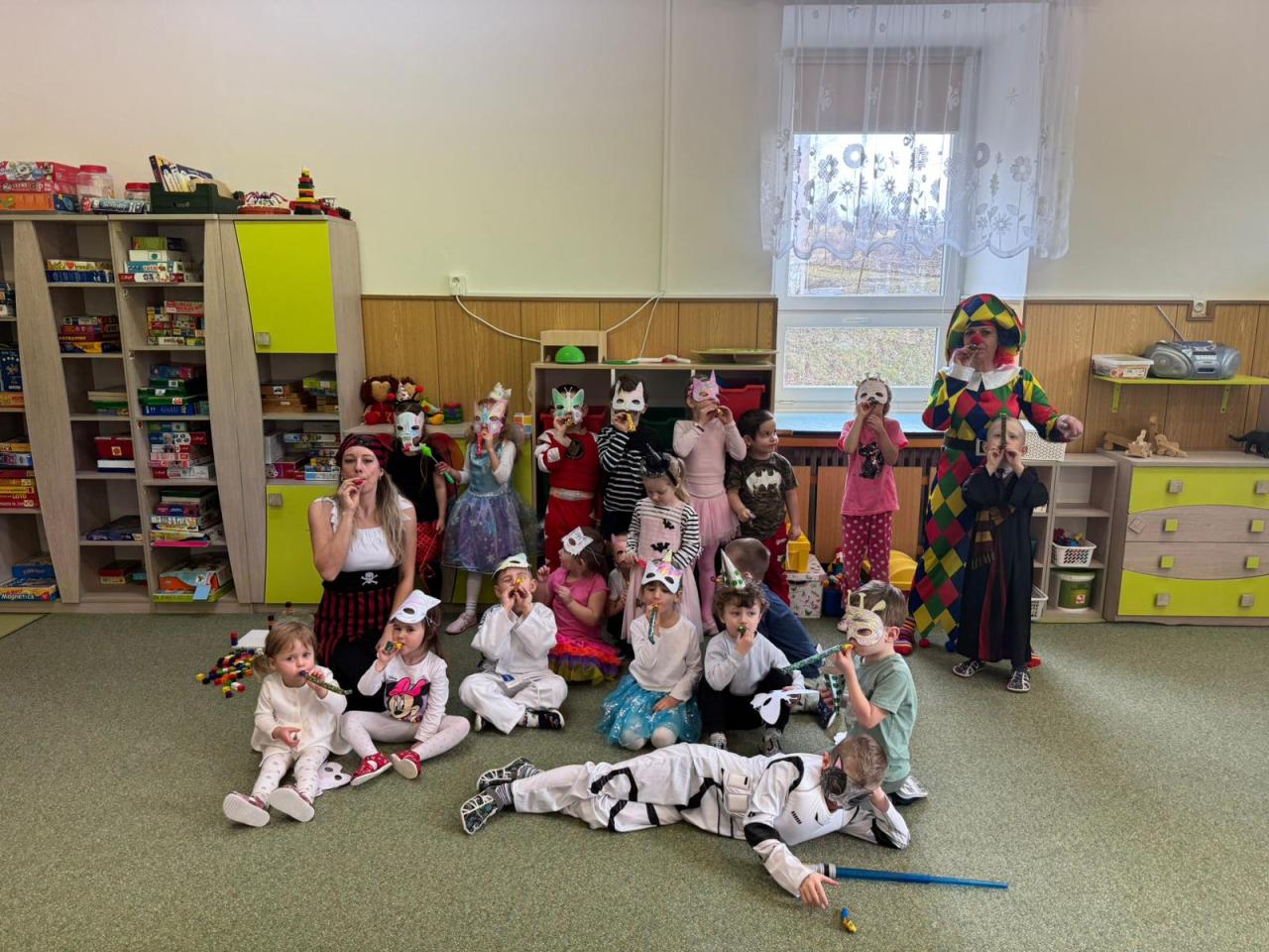 Tento týden se u nás v MŠ nesl v duchu Masopustu a karnevalového dovádění. A protože jsme si to chtěli užít opravdu naplno, proměnila se dnes naše školka v barevné království masek, hudby a smíchu.