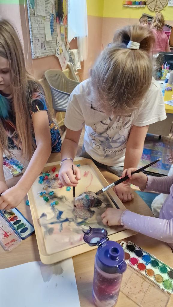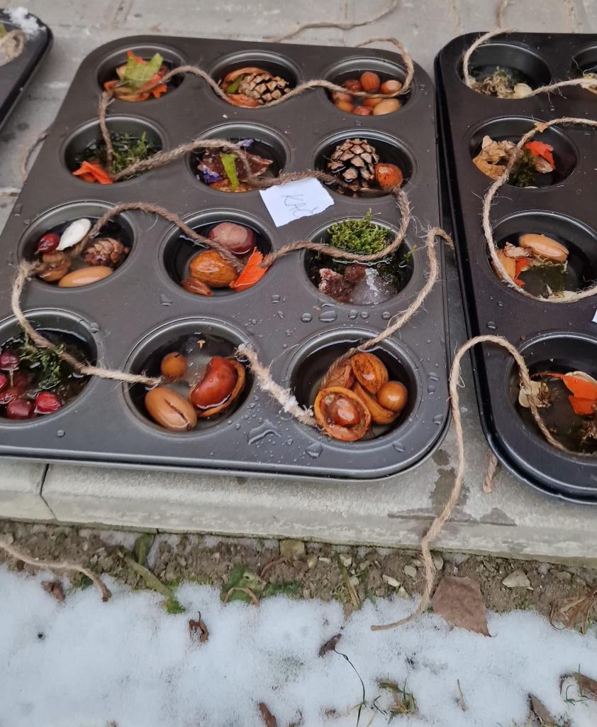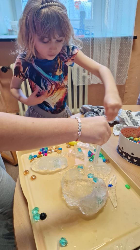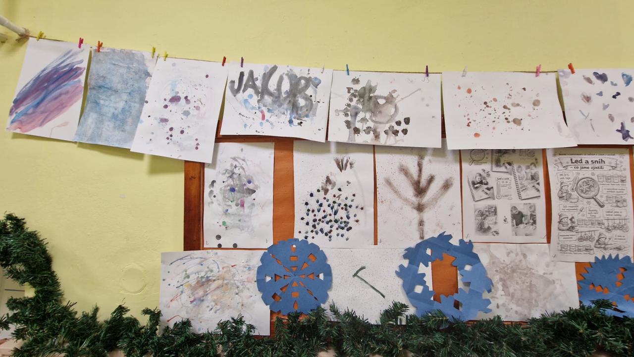 Součástí projektu byla také tvořivá část. Žáci malovali na led i ledem, používali vodové barvy, štětce a ledové kostky a vytvářeli originální abstraktní práce. Z přírodnin, které jsme na podzim společně nasbírali, vznikly ledové ozdoby. Ty jsme nechali venku zmrznout a ozdobili jimi prostor před školou.