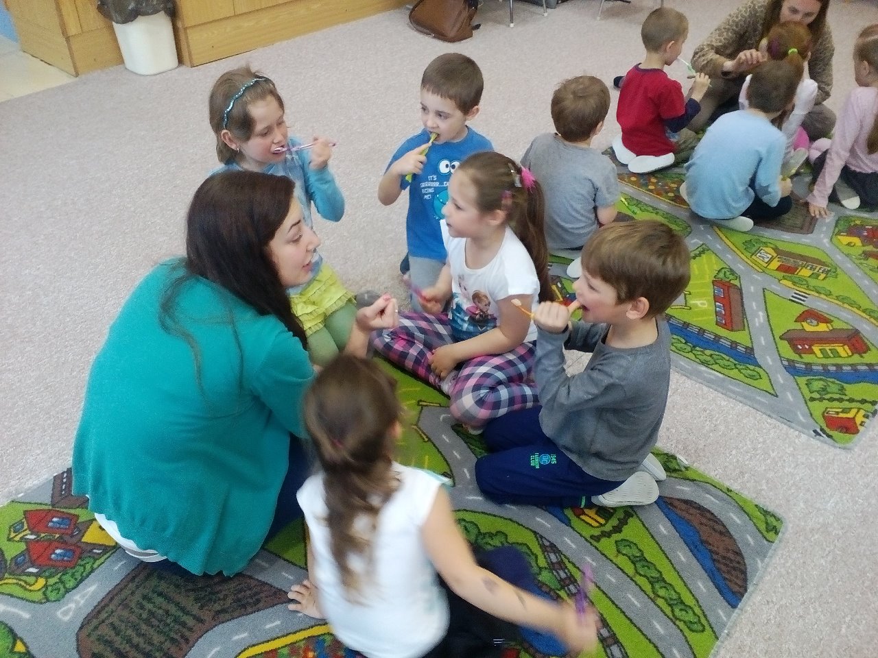 Foto z návštěvy studentek lékařské fakulty - obor zubní lékařství - 8. dubna u nás v mateřské a základní škole.