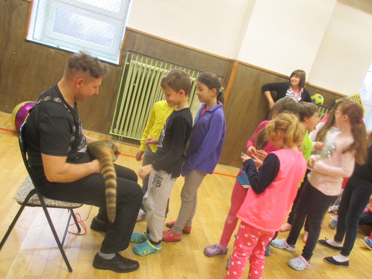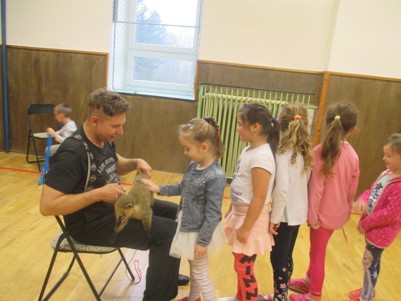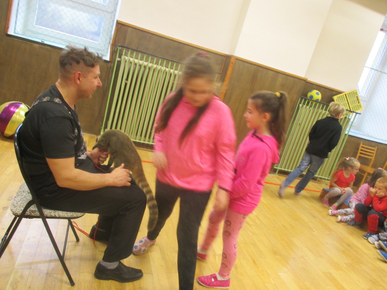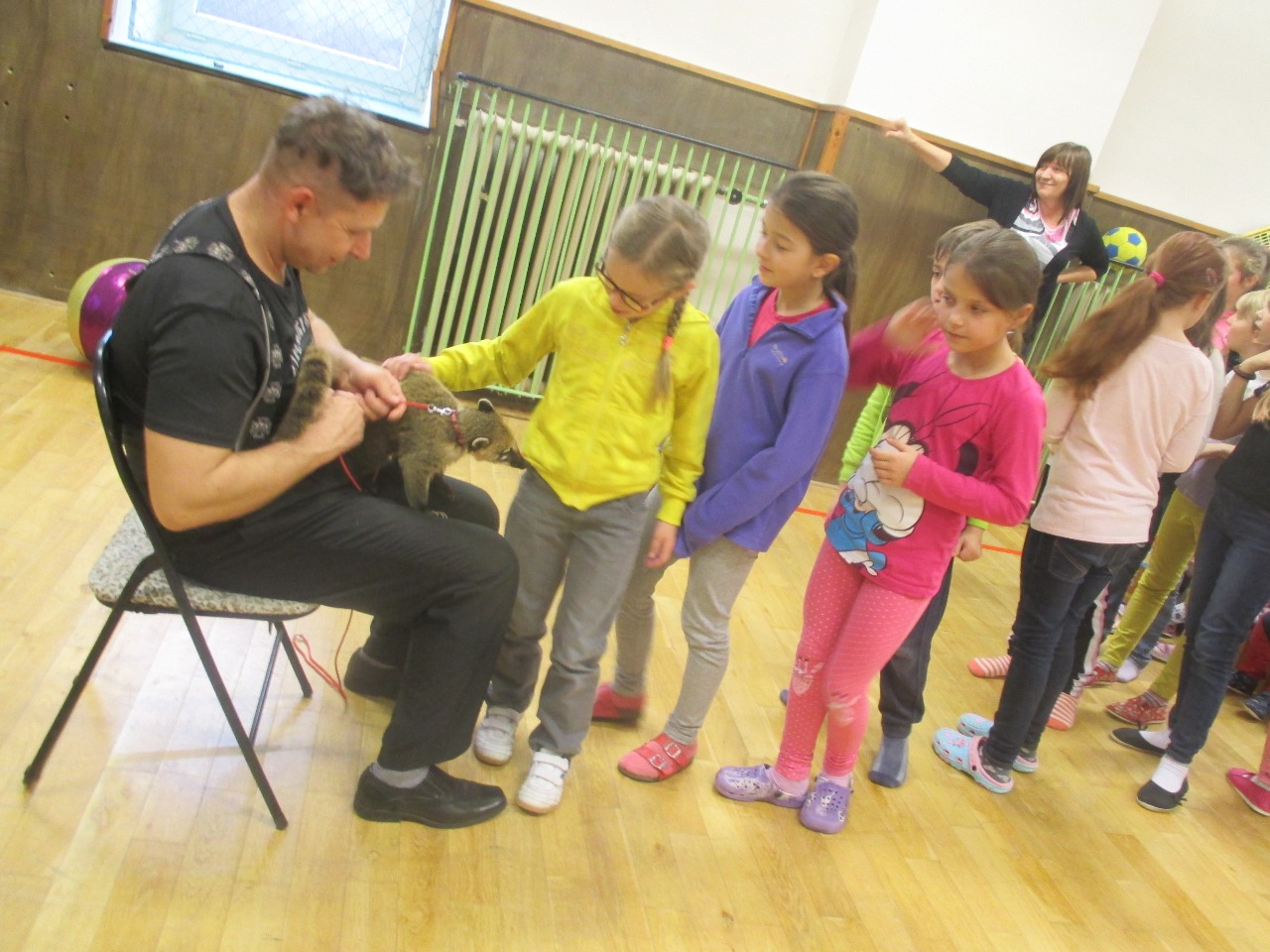 Ve čtvrtek 21. listopadu přijel za námi medvídek mýval se svým pánem a dalšími zvířecími kamarády - cvičenými pejsky. Viděli jsme žonglování, kouzlení a na konec jsme si všichni mohli malého mývala pohladit.