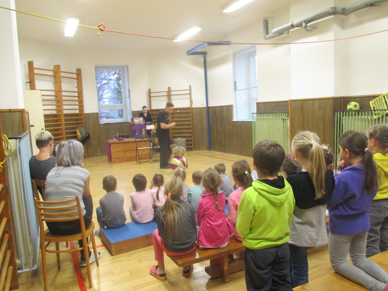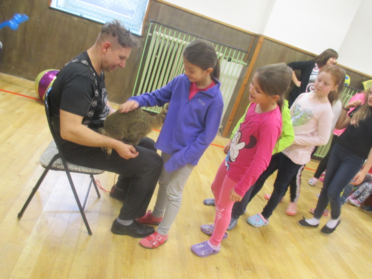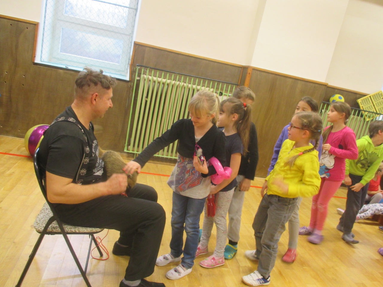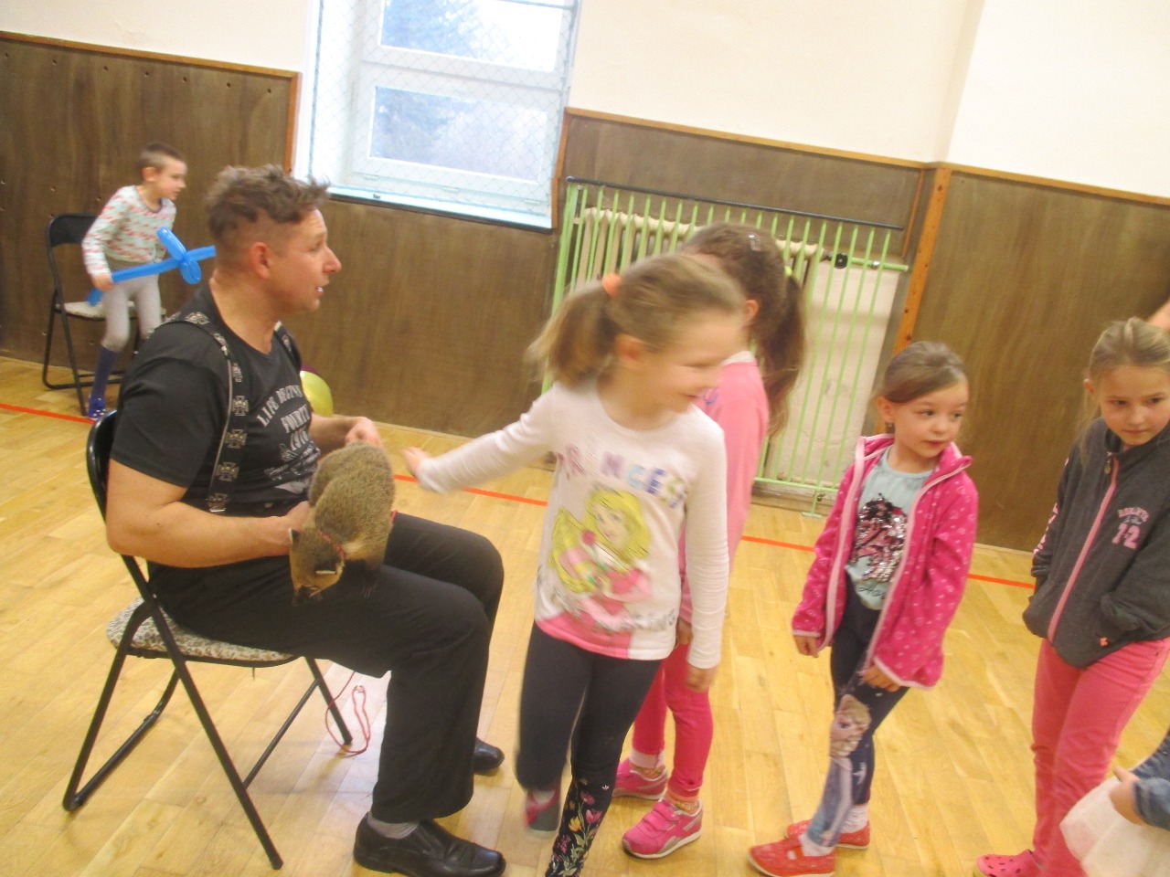 Ve čtvrtek 21. listopadu přijel za námi medvídek mýval se svým pánem a dalšími zvířecími kamarády - cvičenými pejsky. Viděli jsme žonglování, kouzlení a na konec jsme si všichni mohli malého mývala pohladit.
