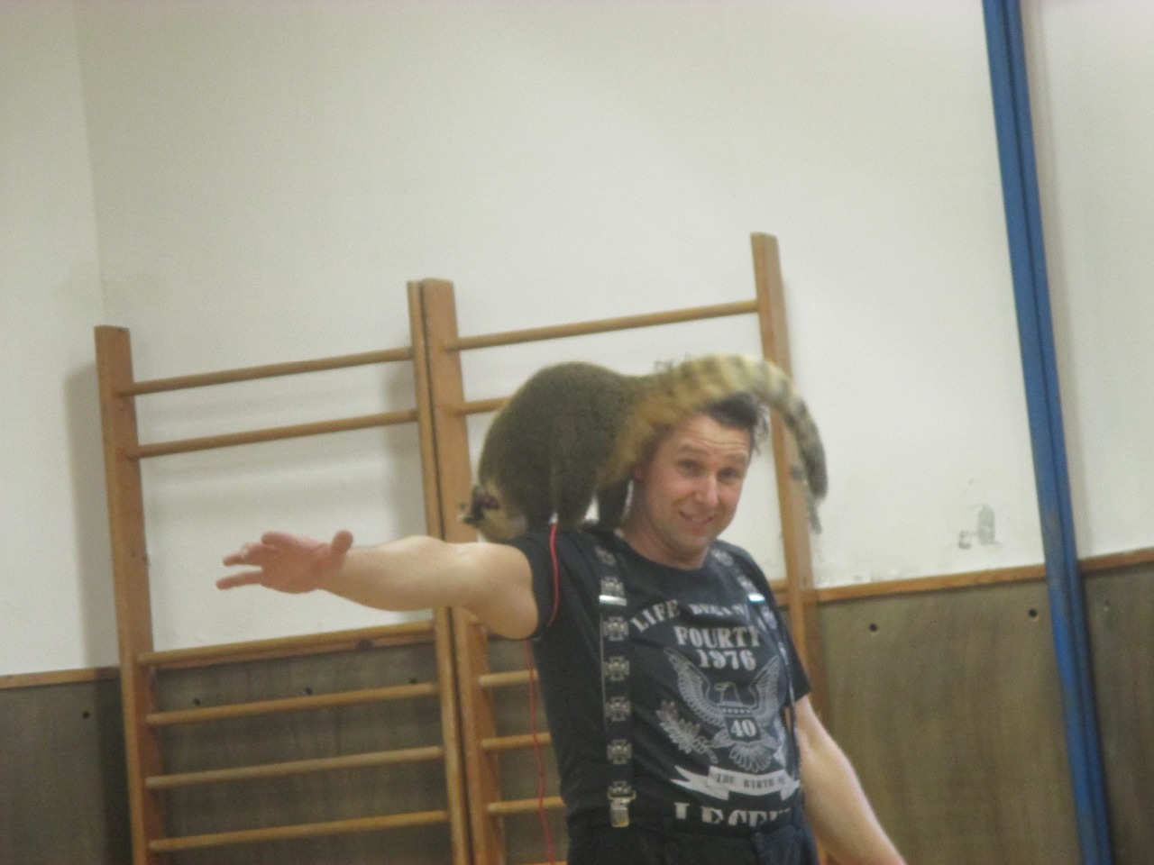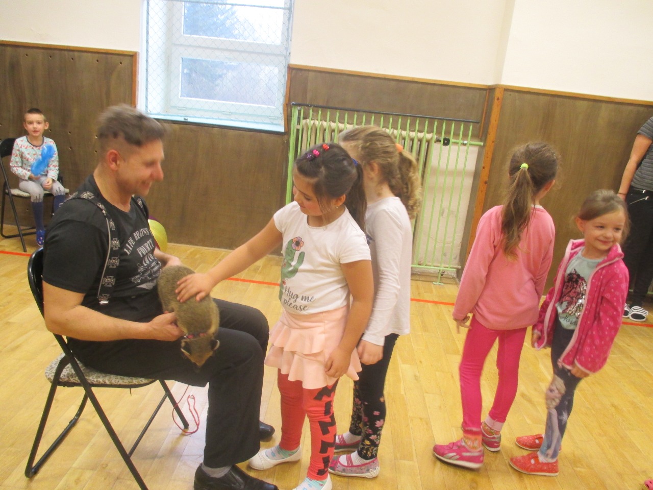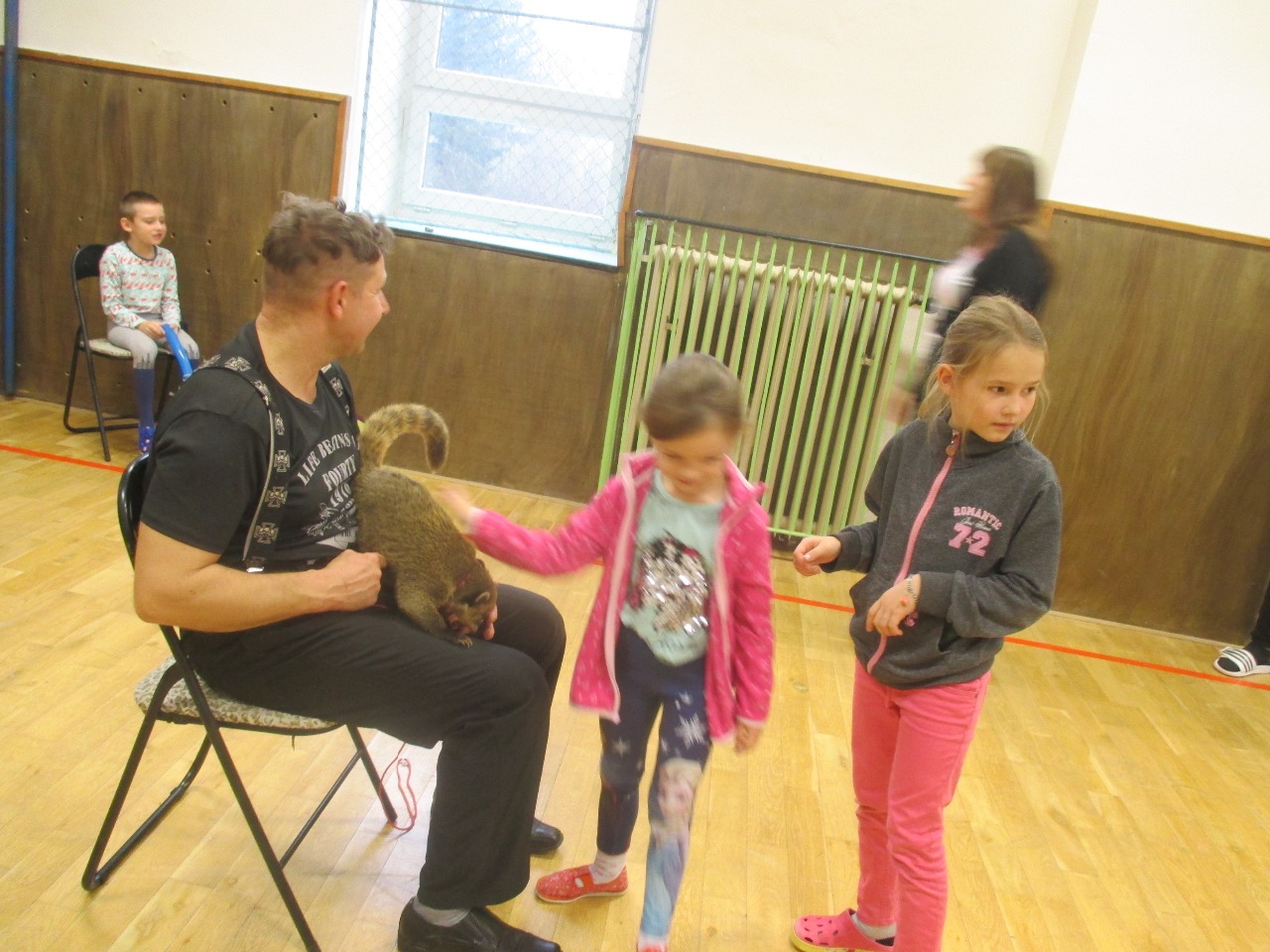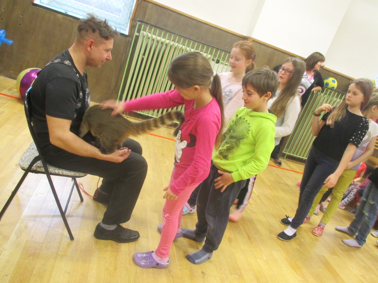 Ve čtvrtek 21. listopadu přijel za námi medvídek mýval se svým pánem a dalšími zvířecími kamarády - cvičenými pejsky. Viděli jsme žonglování, kouzlení a na konec jsme si všichni mohli malého mývala pohladit.