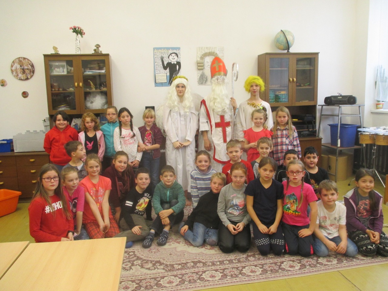 Ve škole nejvíc času patří nácviku na besídku pro veřejnost, ale také nás navštíví Mikuláš s anděly a čerty. Pečeme si perníčky, které si později i sami nazdobíme. Před odchodem na vánoční prázdniny přespíme ve škole. Paní kuchařky nám slavnostně vyzdobí jídelnu a uvaří "štědrovečerní" večeři. Sníme si ji při svíčkách a pak si jdeme rozdat dárky, které jsme si připravili navzájem. Pod stromečkem ale bývá i nečekané překvapení - dárky do školní družiny. A neobejde se to ani bez zpívání koled - prostě pravá vánoční atmosféra.